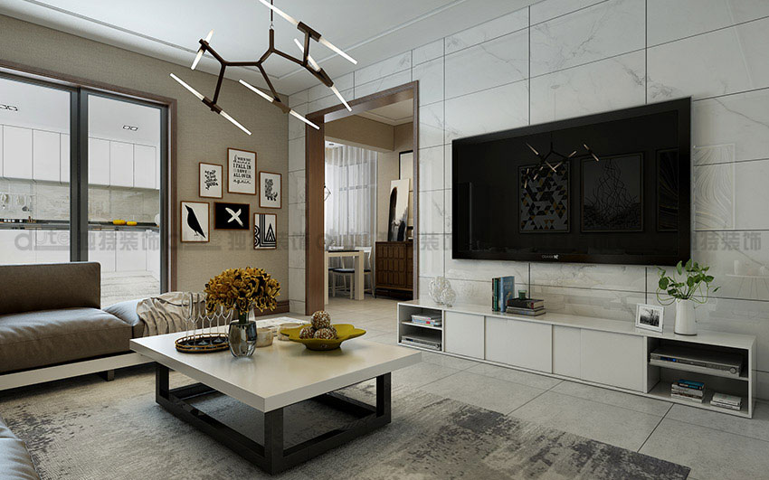 整體方案以現代風格為主,主要采用米色系列,戶主是一對青年夫妻,整體裝修以溫馨為主。整套方案空間感比較良好,電視墻采用米黃色墻磚通鋪做背景墻。吊頂造型采用回字形吊頂加上筒燈和燈帶,整個空間非常溫馨。客餐廳地面整體采用米色系列拋釉大地磚通鋪。搭配上實木框架,棉麻材質的布藝沙發,簡單而又靜雅。