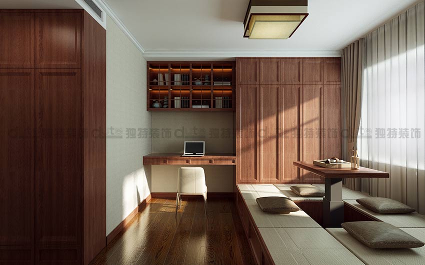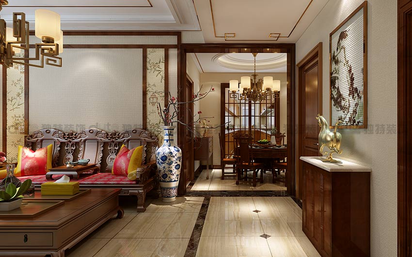 整體方案以新中式風格為主,主要采用米色系列,家具選用顏色偏穩重的實木家具,戶主是一對中年夫妻,整體裝修以穩重得體為主。整套方案空間感比較良好,整個家的墻壁使用米色壁紙,顯得更加穩重大氣。吊頂造型采用回字形吊頂和地面的拼花進行一個呼應,頂面中間加一圈鈦金條,穩重之中不失時尚。搭配上整套實木家具,簡單而又靜雅,是整個家的靈魂色所在。 “人,詩意地棲居在大地上。”自古以來,文人雅士寄情山水、吟詩作畫,即是詩意棲居的體現,他們富于人文雅趣的生活方式,依然是許多現代人心中的追求和向往。