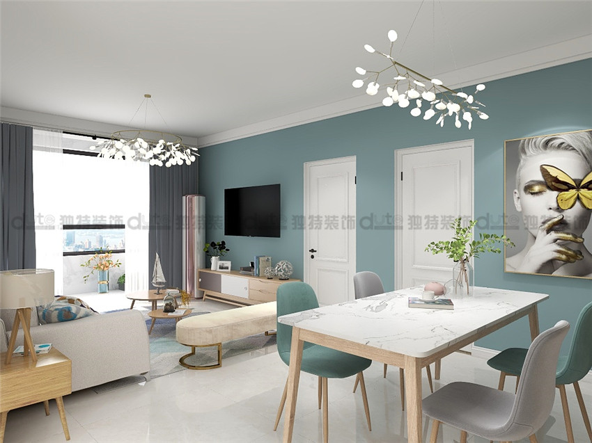 案例說明:本案采用簡單時尚的設計理念,客戶常住人口為三口之家,父母偶爾過來,結合原木色的家具套色,使整個空間有了原生態的感覺,用色大膽,電視墻采用藍綠色做為主色調,不僅可以劃分區域,還能突出亮點。